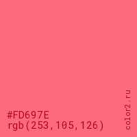 Цвет #FD697E в цветовой модели RGB обозначается тремя октетами (253, 105, 126) в десятичном формате и #FD697E в шестнадцатиричном (hex) формате, которые являются интенсивностью красного 253 (hex FD), интенсивность зелёного 105 (hex 69) и интенсивность синего 126 (hex 7E).