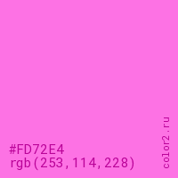 Цвет #FD72E4 в цветовой модели RGB обозначается тремя октетами (253, 114, 228) в десятичном формате и #FD72E4 в шестнадцатиричном (hex) формате, которые являются интенсивностью красного 253 (hex FD), интенсивность зелёного 114 (hex 72) и интенсивность синего 228 (hex E4).