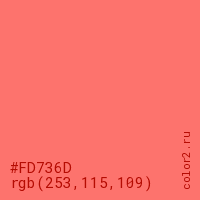 Цвет #FD736D в цветовой модели RGB обозначается тремя октетами (253, 115, 109) в десятичном формате и #FD736D в шестнадцатиричном (hex) формате, которые являются интенсивностью красного 253 (hex FD), интенсивность зелёного 115 (hex 73) и интенсивность синего 109 (hex 6D).