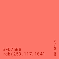 Цвет #FD7568 в цветовой модели RGB обозначается тремя октетами (253, 117, 104) в десятичном формате и #FD7568 в шестнадцатиричном (hex) формате, которые являются интенсивностью красного 253 (hex FD), интенсивность зелёного 117 (hex 75) и интенсивность синего 104 (hex 68).