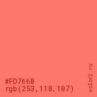 Цвет #FD766B в цветовой модели RGB обозначается тремя октетами (253, 118, 107) в десятичном формате и #FD766B в шестнадцатиричном (hex) формате, которые являются интенсивностью красного 253 (hex FD), интенсивность зелёного 118 (hex 76) и интенсивность синего 107 (hex 6B).