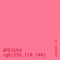 Цвет #FD7694 в цветовой модели RGB обозначается тремя октетами (253, 118, 148) в десятичном формате и #FD7694 в шестнадцатиричном (hex) формате, которые являются интенсивностью красного 253 (hex FD), интенсивность зелёного 118 (hex 76) и интенсивность синего 148 (hex 94).