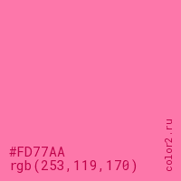 Цвет #FD77AA в цветовой модели RGB обозначается тремя октетами (253, 119, 170) в десятичном формате и #FD77AA в шестнадцатиричном (hex) формате, которые являются интенсивностью красного 253 (hex FD), интенсивность зелёного 119 (hex 77) и интенсивность синего 170 (hex AA).