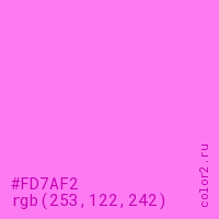 Цвет #FD7AF2 в цветовой модели RGB обозначается тремя октетами (253, 122, 242) в десятичном формате и #FD7AF2 в шестнадцатиричном (hex) формате, которые являются интенсивностью красного 253 (hex FD), интенсивность зелёного 122 (hex 7A) и интенсивность синего 242 (hex F2).
