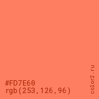 Цвет #FD7E60 в цветовой модели RGB обозначается тремя октетами (253, 126, 96) в десятичном формате и #FD7E60 в шестнадцатиричном (hex) формате, которые являются интенсивностью красного 253 (hex FD), интенсивность зелёного 126 (hex 7E) и интенсивность синего 96 (hex 60).