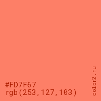 Цвет #FD7F67 в цветовой модели RGB обозначается тремя октетами (253, 127, 103) в десятичном формате и #FD7F67 в шестнадцатиричном (hex) формате, которые являются интенсивностью красного 253 (hex FD), интенсивность зелёного 127 (hex 7F) и интенсивность синего 103 (hex 67).