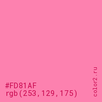 Цвет #FD81AF в цветовой модели RGB обозначается тремя октетами (253, 129, 175) в десятичном формате и #FD81AF в шестнадцатиричном (hex) формате, которые являются интенсивностью красного 253 (hex FD), интенсивность зелёного 129 (hex 81) и интенсивность синего 175 (hex AF).