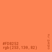Цвет #FD8252 в цветовой модели RGB обозначается тремя октетами (253, 130, 82) в десятичном формате и #FD8252 в шестнадцатиричном (hex) формате, которые являются интенсивностью красного 253 (hex FD), интенсивность зелёного 130 (hex 82) и интенсивность синего 82 (hex 52).