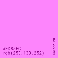 Цвет #FD85FC в цветовой модели RGB обозначается тремя октетами (253, 133, 252) в десятичном формате и #FD85FC в шестнадцатиричном (hex) формате, которые являются интенсивностью красного 253 (hex FD), интенсивность зелёного 133 (hex 85) и интенсивность синего 252 (hex FC).