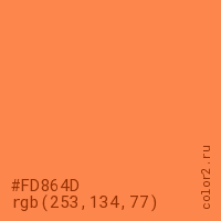 Цвет #FD864D в цветовой модели RGB обозначается тремя октетами (253, 134, 77) в десятичном формате и #FD864D в шестнадцатиричном (hex) формате, которые являются интенсивностью красного 253 (hex FD), интенсивность зелёного 134 (hex 86) и интенсивность синего 77 (hex 4D).