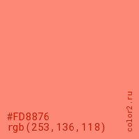Цвет #FD8876 в цветовой модели RGB обозначается тремя октетами (253, 136, 118) в десятичном формате и #FD8876 в шестнадцатиричном (hex) формате, которые являются интенсивностью красного 253 (hex FD), интенсивность зелёного 136 (hex 88) и интенсивность синего 118 (hex 76).