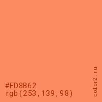 Цвет #FD8B62 в цветовой модели RGB обозначается тремя октетами (253, 139, 98) в десятичном формате и #FD8B62 в шестнадцатиричном (hex) формате, которые являются интенсивностью красного 253 (hex FD), интенсивность зелёного 139 (hex 8B) и интенсивность синего 98 (hex 62).