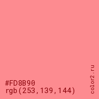 Цвет #FD8B90 в цветовой модели RGB обозначается тремя октетами (253, 139, 144) в десятичном формате и #FD8B90 в шестнадцатиричном (hex) формате, которые являются интенсивностью красного 253 (hex FD), интенсивность зелёного 139 (hex 8B) и интенсивность синего 144 (hex 90).