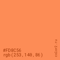 Цвет #FD8C56 в цветовой модели RGB обозначается тремя октетами (253, 140, 86) в десятичном формате и #FD8C56 в шестнадцатиричном (hex) формате, которые являются интенсивностью красного 253 (hex FD), интенсивность зелёного 140 (hex 8C) и интенсивность синего 86 (hex 56).