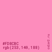 Цвет #FD8CBC в цветовой модели RGB обозначается тремя октетами (253, 140, 188) в десятичном формате и #FD8CBC в шестнадцатиричном (hex) формате, которые являются интенсивностью красного 253 (hex FD), интенсивность зелёного 140 (hex 8C) и интенсивность синего 188 (hex BC).
