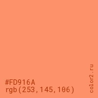 Цвет #FD916A в цветовой модели RGB обозначается тремя октетами (253, 145, 106) в десятичном формате и #FD916A в шестнадцатиричном (hex) формате, которые являются интенсивностью красного 253 (hex FD), интенсивность зелёного 145 (hex 91) и интенсивность синего 106 (hex 6A).