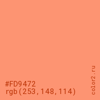 Цвет #FD9472 в цветовой модели RGB обозначается тремя октетами (253, 148, 114) в десятичном формате и #FD9472 в шестнадцатиричном (hex) формате, которые являются интенсивностью красного 253 (hex FD), интенсивность зелёного 148 (hex 94) и интенсивность синего 114 (hex 72).