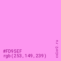 Цвет #FD95EF в цветовой модели RGB обозначается тремя октетами (253, 149, 239) в десятичном формате и #FD95EF в шестнадцатиричном (hex) формате, которые являются интенсивностью красного 253 (hex FD), интенсивность зелёного 149 (hex 95) и интенсивность синего 239 (hex EF).