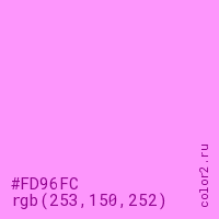 Цвет #FD96FC в цветовой модели RGB обозначается тремя октетами (253, 150, 252) в десятичном формате и #FD96FC в шестнадцатиричном (hex) формате, которые являются интенсивностью красного 253 (hex FD), интенсивность зелёного 150 (hex 96) и интенсивность синего 252 (hex FC).