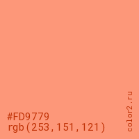 Цвет #FD9779 в цветовой модели RGB обозначается тремя октетами (253, 151, 121) в десятичном формате и #FD9779 в шестнадцатиричном (hex) формате, которые являются интенсивностью красного 253 (hex FD), интенсивность зелёного 151 (hex 97) и интенсивность синего 121 (hex 79).