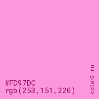 Цвет #FD97DC в цветовой модели RGB обозначается тремя октетами (253, 151, 220) в десятичном формате и #FD97DC в шестнадцатиричном (hex) формате, которые являются интенсивностью красного 253 (hex FD), интенсивность зелёного 151 (hex 97) и интенсивность синего 220 (hex DC).