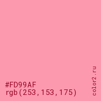 Цвет #FD99AF в цветовой модели RGB обозначается тремя октетами (253, 153, 175) в десятичном формате и #FD99AF в шестнадцатиричном (hex) формате, которые являются интенсивностью красного 253 (hex FD), интенсивность зелёного 153 (hex 99) и интенсивность синего 175 (hex AF).
