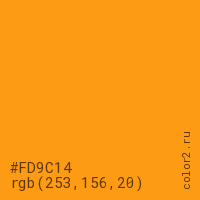 Цвет #FD9C14 в цветовой модели RGB обозначается тремя октетами (253, 156, 20) в десятичном формате и #FD9C14 в шестнадцатиричном (hex) формате, которые являются интенсивностью красного 253 (hex FD), интенсивность зелёного 156 (hex 9C) и интенсивность синего 20 (hex 14).