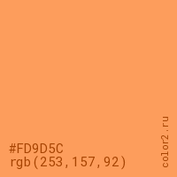 Цвет #FD9D5C в цветовой модели RGB обозначается тремя октетами (253, 157, 92) в десятичном формате и #FD9D5C в шестнадцатиричном (hex) формате, которые являются интенсивностью красного 253 (hex FD), интенсивность зелёного 157 (hex 9D) и интенсивность синего 92 (hex 5C).