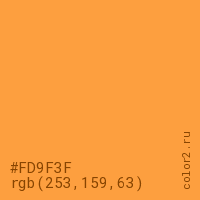 Цвет #FD9F3F в цветовой модели RGB обозначается тремя октетами (253, 159, 63) в десятичном формате и #FD9F3F в шестнадцатиричном (hex) формате, которые являются интенсивностью красного 253 (hex FD), интенсивность зелёного 159 (hex 9F) и интенсивность синего 63 (hex 3F).