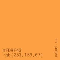 Цвет #FD9F43 в цветовой модели RGB обозначается тремя октетами (253, 159, 67) в десятичном формате и #FD9F43 в шестнадцатиричном (hex) формате, которые являются интенсивностью красного 253 (hex FD), интенсивность зелёного 159 (hex 9F) и интенсивность синего 67 (hex 43).