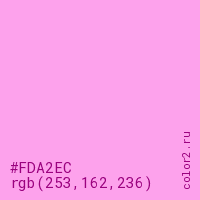 Цвет #FDA2EC в цветовой модели RGB обозначается тремя октетами (253, 162, 236) в десятичном формате и #FDA2EC в шестнадцатиричном (hex) формате, которые являются интенсивностью красного 253 (hex FD), интенсивность зелёного 162 (hex A2) и интенсивность синего 236 (hex EC).