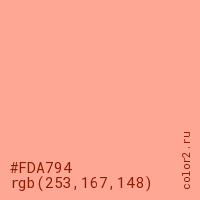 Цвет #FDA794 в цветовой модели RGB обозначается тремя октетами (253, 167, 148) в десятичном формате и #FDA794 в шестнадцатиричном (hex) формате, которые являются интенсивностью красного 253 (hex FD), интенсивность зелёного 167 (hex A7) и интенсивность синего 148 (hex 94).
