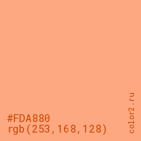 Цвет #FDA880 в цветовой модели RGB обозначается тремя октетами (253, 168, 128) в десятичном формате и #FDA880 в шестнадцатиричном (hex) формате, которые являются интенсивностью красного 253 (hex FD), интенсивность зелёного 168 (hex A8) и интенсивность синего 128 (hex 80).