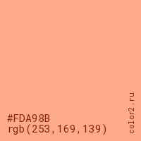 Цвет #FDA98B в цветовой модели RGB обозначается тремя октетами (253, 169, 139) в десятичном формате и #FDA98B в шестнадцатиричном (hex) формате, которые являются интенсивностью красного 253 (hex FD), интенсивность зелёного 169 (hex A9) и интенсивность синего 139 (hex 8B).