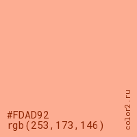 Цвет #FDAD92 в цветовой модели RGB обозначается тремя октетами (253, 173, 146) в десятичном формате и #FDAD92 в шестнадцатиричном (hex) формате, которые являются интенсивностью красного 253 (hex FD), интенсивность зелёного 173 (hex AD) и интенсивность синего 146 (hex 92).
