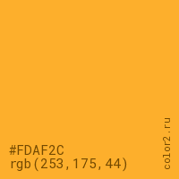 Цвет #FDAF2C в цветовой модели RGB обозначается тремя октетами (253, 175, 44) в десятичном формате и #FDAF2C в шестнадцатиричном (hex) формате, которые являются интенсивностью красного 253 (hex FD), интенсивность зелёного 175 (hex AF) и интенсивность синего 44 (hex 2C).