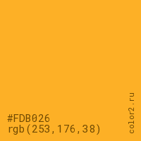 Цвет #FDB026 в цветовой модели RGB обозначается тремя октетами (253, 176, 38) в десятичном формате и #FDB026 в шестнадцатиричном (hex) формате, которые являются интенсивностью красного 253 (hex FD), интенсивность зелёного 176 (hex B0) и интенсивность синего 38 (hex 26).