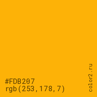 Цвет #FDB207 в цветовой модели RGB обозначается тремя октетами (253, 178, 7) в десятичном формате и #FDB207 в шестнадцатиричном (hex) формате, которые являются интенсивностью красного 253 (hex FD), интенсивность зелёного 178 (hex B2) и интенсивность синего 7 (hex 07).