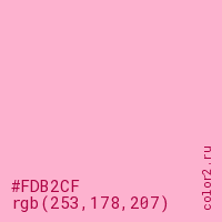 Цвет #FDB2CF в цветовой модели RGB обозначается тремя октетами (253, 178, 207) в десятичном формате и #FDB2CF в шестнадцатиричном (hex) формате, которые являются интенсивностью красного 253 (hex FD), интенсивность зелёного 178 (hex B2) и интенсивность синего 207 (hex CF).
