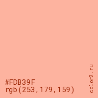 Цвет #FDB39F в цветовой модели RGB обозначается тремя октетами (253, 179, 159) в десятичном формате и #FDB39F в шестнадцатиричном (hex) формате, которые являются интенсивностью красного 253 (hex FD), интенсивность зелёного 179 (hex B3) и интенсивность синего 159 (hex 9F).