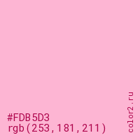 Цвет #FDB5D3 в цветовой модели RGB обозначается тремя октетами (253, 181, 211) в десятичном формате и #FDB5D3 в шестнадцатиричном (hex) формате, которые являются интенсивностью красного 253 (hex FD), интенсивность зелёного 181 (hex B5) и интенсивность синего 211 (hex D3).