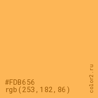 Цвет #FDB656 в цветовой модели RGB обозначается тремя октетами (253, 182, 86) в десятичном формате и #FDB656 в шестнадцатиричном (hex) формате, которые являются интенсивностью красного 253 (hex FD), интенсивность зелёного 182 (hex B6) и интенсивность синего 86 (hex 56).