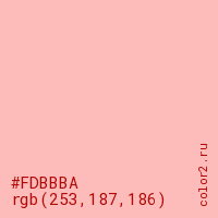 Цвет #FDBBBA в цветовой модели RGB обозначается тремя октетами (253, 187, 186) в десятичном формате и #FDBBBA в шестнадцатиричном (hex) формате, которые являются интенсивностью красного 253 (hex FD), интенсивность зелёного 187 (hex BB) и интенсивность синего 186 (hex BA).
