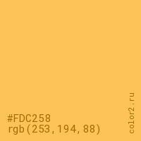 Цвет #FDC258 в цветовой модели RGB обозначается тремя октетами (253, 194, 88) в десятичном формате и #FDC258 в шестнадцатиричном (hex) формате, которые являются интенсивностью красного 253 (hex FD), интенсивность зелёного 194 (hex C2) и интенсивность синего 88 (hex 58).