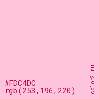 Цвет #FDC4DC в цветовой модели RGB обозначается тремя октетами (253, 196, 220) в десятичном формате и #FDC4DC в шестнадцатиричном (hex) формате, которые являются интенсивностью красного 253 (hex FD), интенсивность зелёного 196 (hex C4) и интенсивность синего 220 (hex DC).