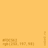Цвет #FDC562 в цветовой модели RGB обозначается тремя октетами (253, 197, 98) в десятичном формате и #FDC562 в шестнадцатиричном (hex) формате, которые являются интенсивностью красного 253 (hex FD), интенсивность зелёного 197 (hex C5) и интенсивность синего 98 (hex 62).