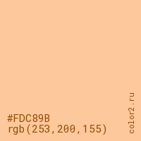 Цвет #FDC89B в цветовой модели RGB обозначается тремя октетами (253, 200, 155) в десятичном формате и #FDC89B в шестнадцатиричном (hex) формате, которые являются интенсивностью красного 253 (hex FD), интенсивность зелёного 200 (hex C8) и интенсивность синего 155 (hex 9B).