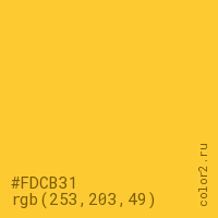 Цвет #FDCB31 в цветовой модели RGB обозначается тремя октетами (253, 203, 49) в десятичном формате и #FDCB31 в шестнадцатиричном (hex) формате, которые являются интенсивностью красного 253 (hex FD), интенсивность зелёного 203 (hex CB) и интенсивность синего 49 (hex 31).
