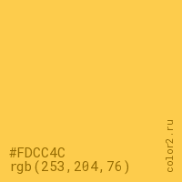 Цвет #FDCC4C в цветовой модели RGB обозначается тремя октетами (253, 204, 76) в десятичном формате и #FDCC4C в шестнадцатиричном (hex) формате, которые являются интенсивностью красного 253 (hex FD), интенсивность зелёного 204 (hex CC) и интенсивность синего 76 (hex 4C).