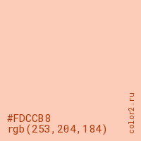 Цвет #FDCCB8 в цветовой модели RGB обозначается тремя октетами (253, 204, 184) в десятичном формате и #FDCCB8 в шестнадцатиричном (hex) формате, которые являются интенсивностью красного 253 (hex FD), интенсивность зелёного 204 (hex CC) и интенсивность синего 184 (hex B8).